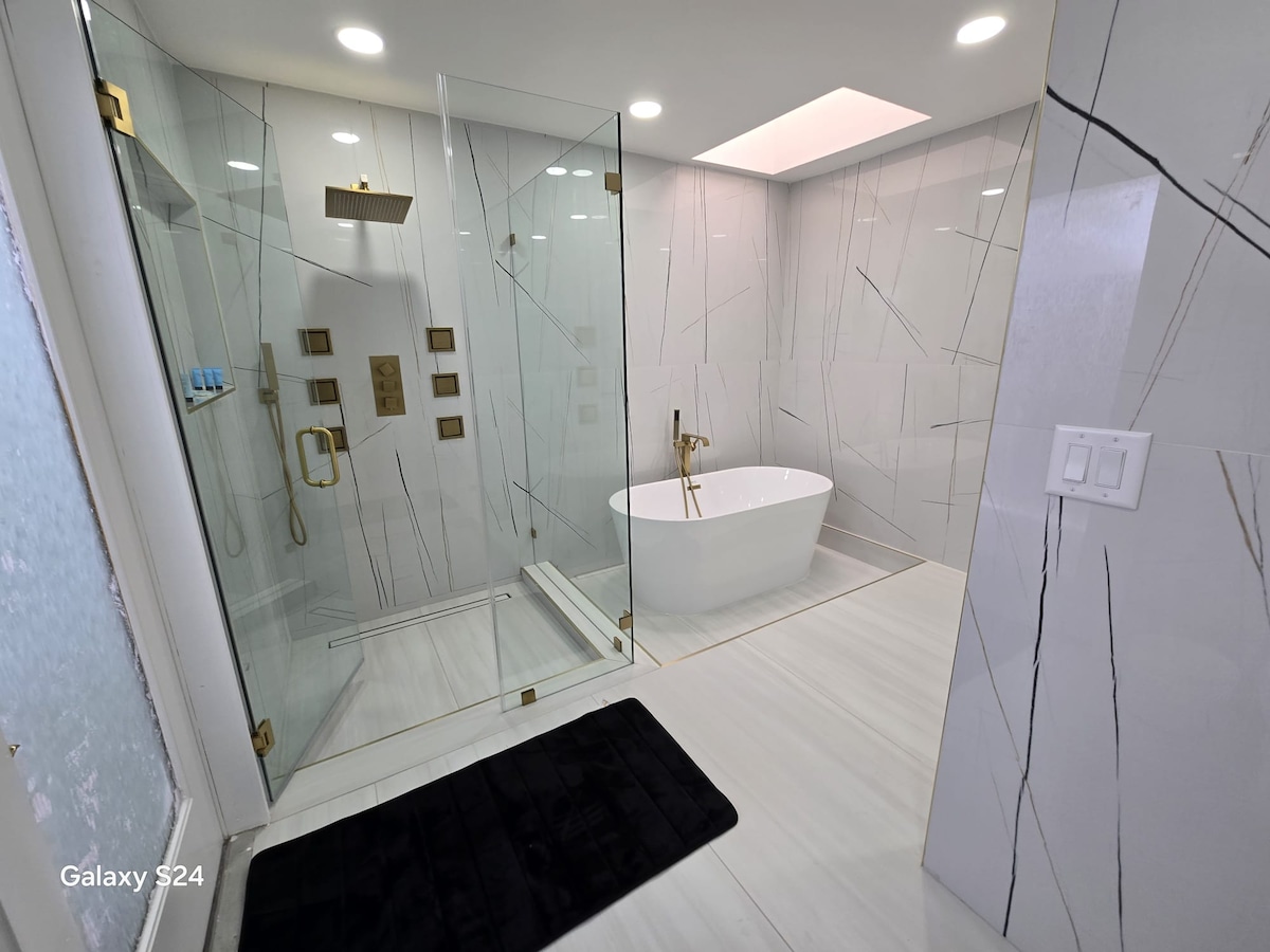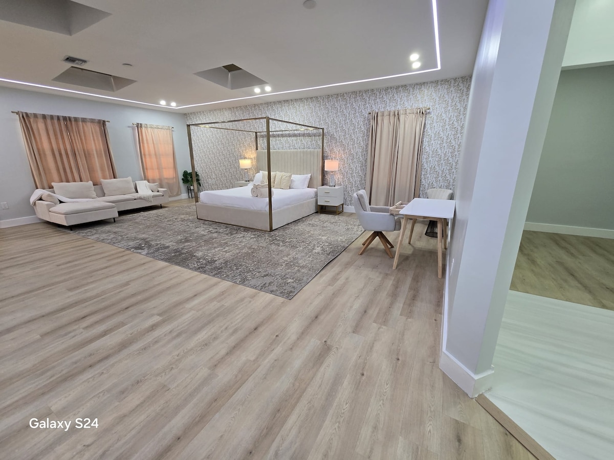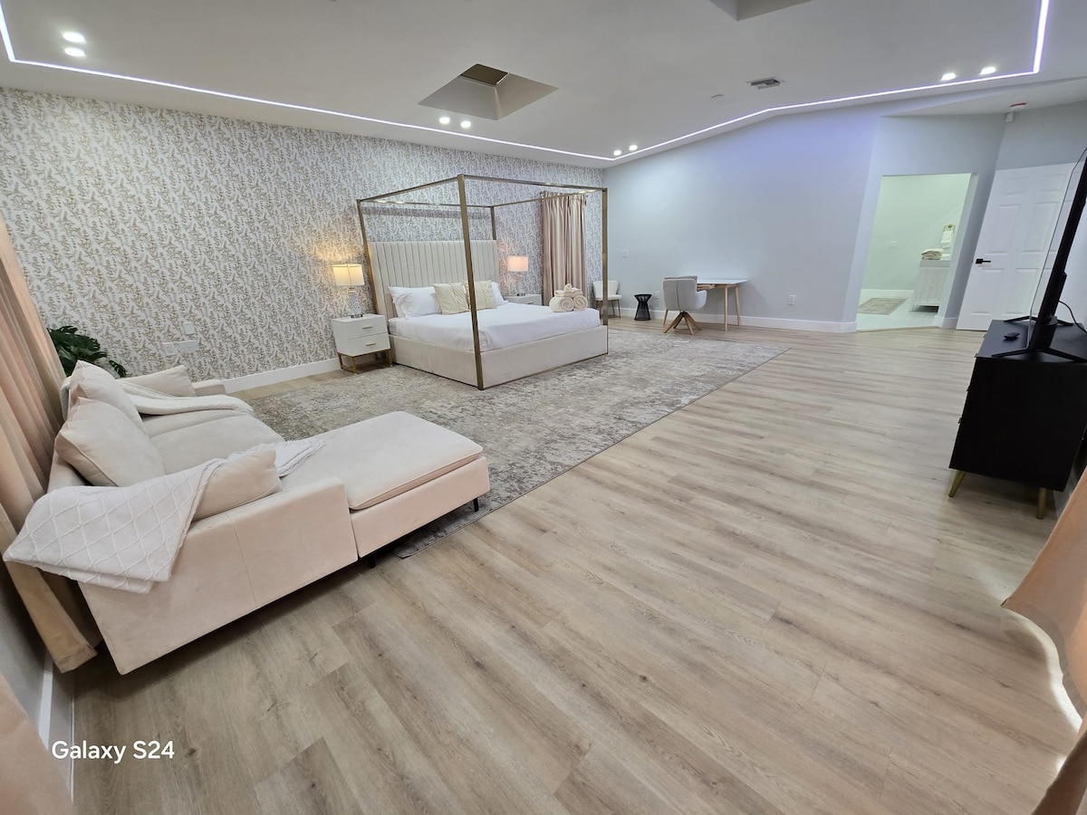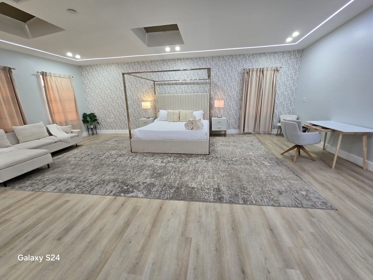 Bedroom 4: Master suite with a king-size bed, private en-suite bathroom featuring a freestanding tub, a spacious walk-in closet, and a makeup station.