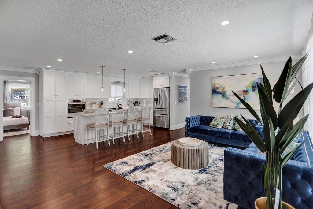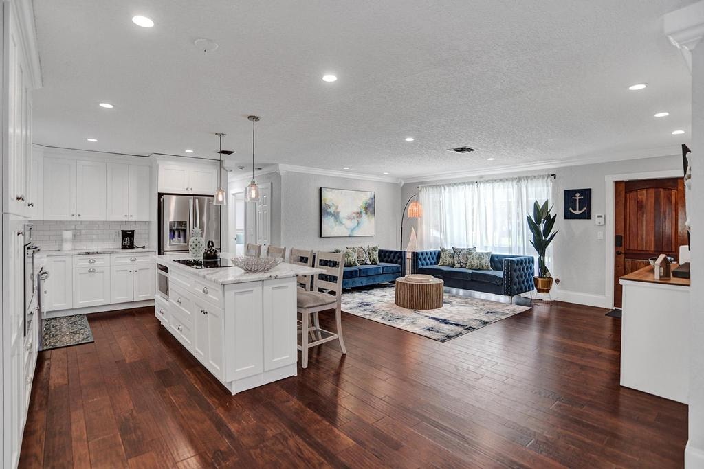 The interior boasts a seamless blend of modern features and tasteful decor, highlighted by natural light and sophisticated flooring. The open layout maximizes every inch of space—most notably in the fully equipped kitchen that flows into the inviting living and dining areas.