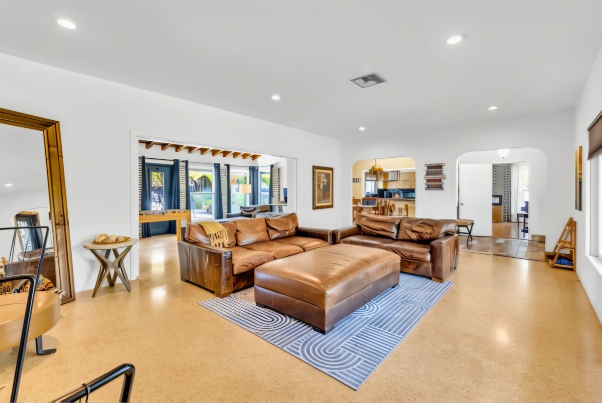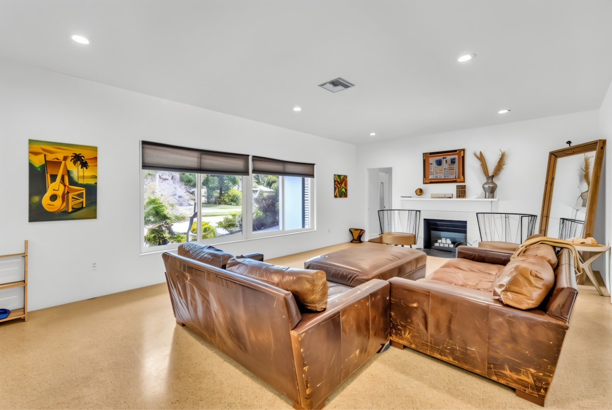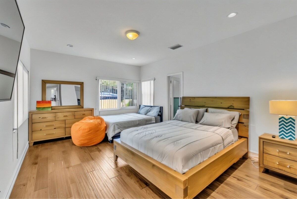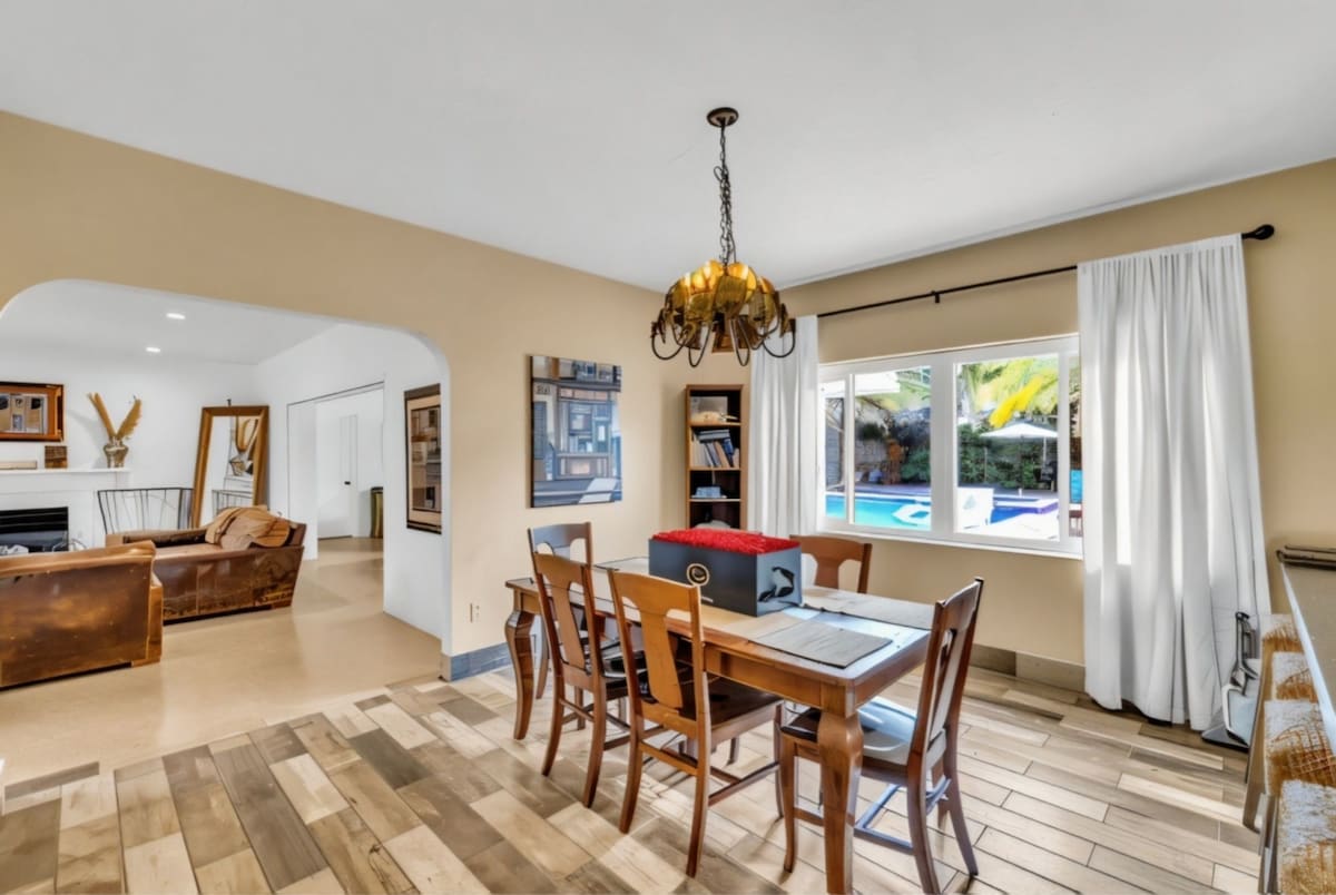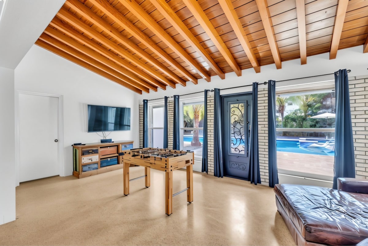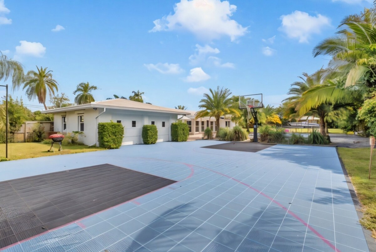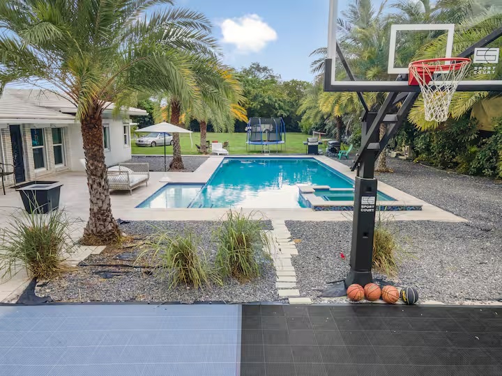 The perfect vacation home awaits you with this stunning 4-bedroom, 3-bathroom modern retreat. Enjoy endless fun with your very own full-size basketball and soccer court, perfect for families and groups. Relax in the huge heated pool—extra big and deep—or unwind in the Jacuzzi after a day at the beach. Evenings are made memorable around the wood fire pit under the stars.